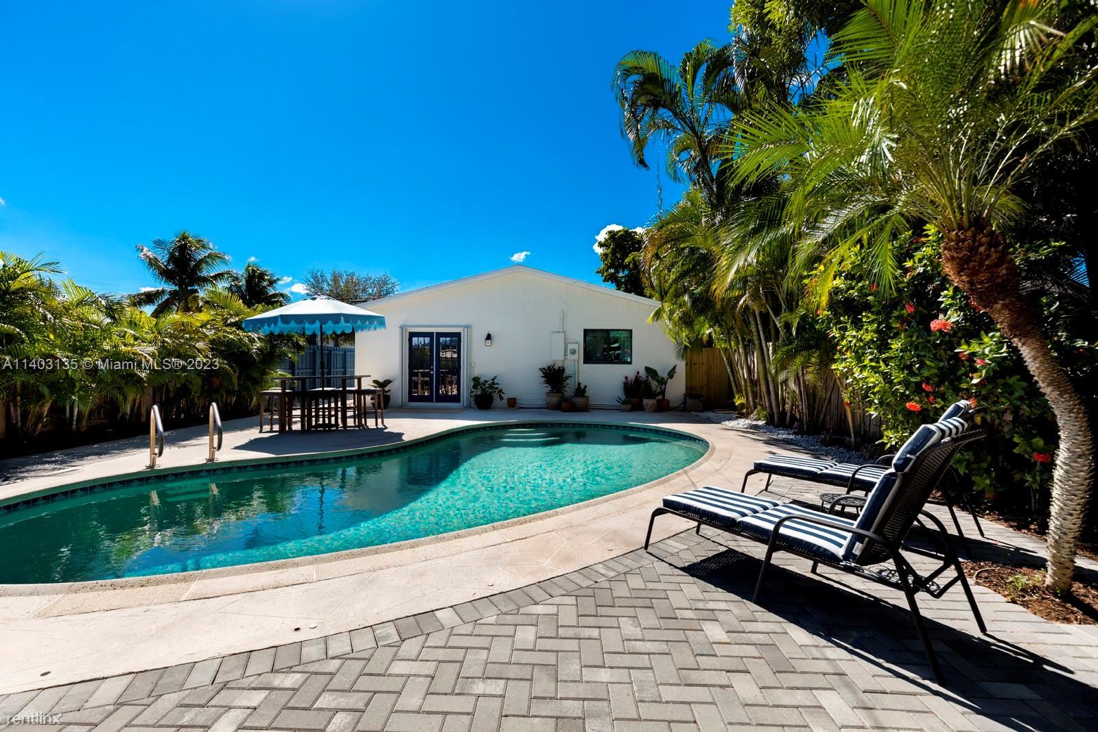 Rent this beautiful 3 bedroom/2 bath oasis + den/office, complete with pool and hot tub. Rent for a minimum of 3 months or up to a year. Nestled near Wilton Drive, Downtown Oakland Park, the beach, and I-95. Discover serenity in your private, tropical backyard, equipped with a covered seating area and lounge furniture. The 4th bedroom, adjacent to the pool, can serve as an ideal office or den. Landlord pays for pool and lawn upkeep, pest control, and WiFi. Tenants cover electric and water. The property can be rented furnished. Includes full size washer/dryer. Lots of closets for storage. To Move In: 1st month and 2 security deposits, and a credit/background check. 1 small pet welcome (up to 20lbs). No smoking. MINIMUM CREDIT SCORE 650. TENANT REQUIRED TO PAY FOR BACKGROUND & CREDIT CHECK. (RLNE8121456)